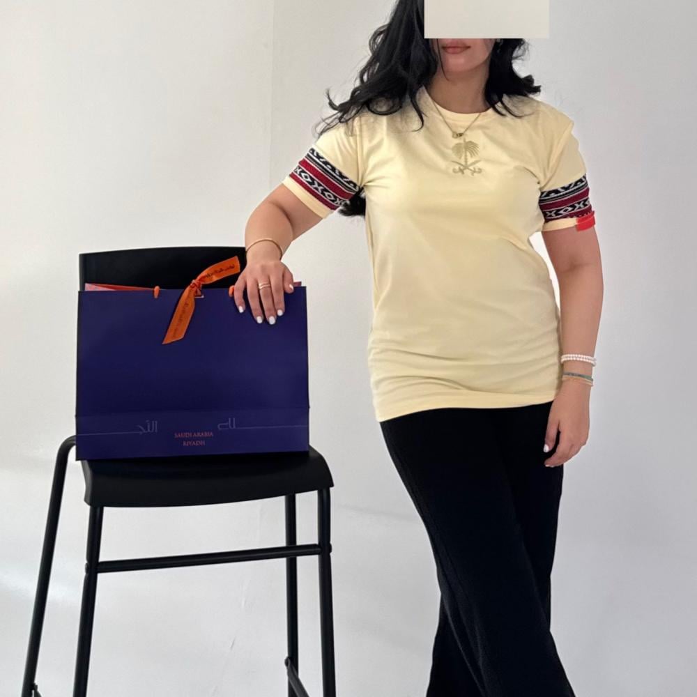 • من الامام سيفين ونخلة ومن الخلف عبارة "عظماء من بلد عظيم" وعلى الاكمام قماش السدو الأحمر
